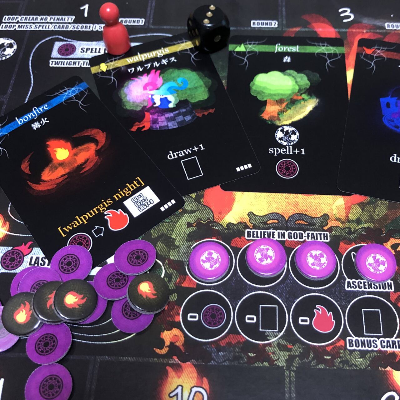 すごろくビルド×ダイスゲームの1~4人まで遊べるボードゲームです。カードを個人ボード上に配置しダイスを使って周回します。様々なカード効果や3人の魔女駒を駆使してダイス運をコントロールします。誰よりもたくさんの篝火を集めましょう。